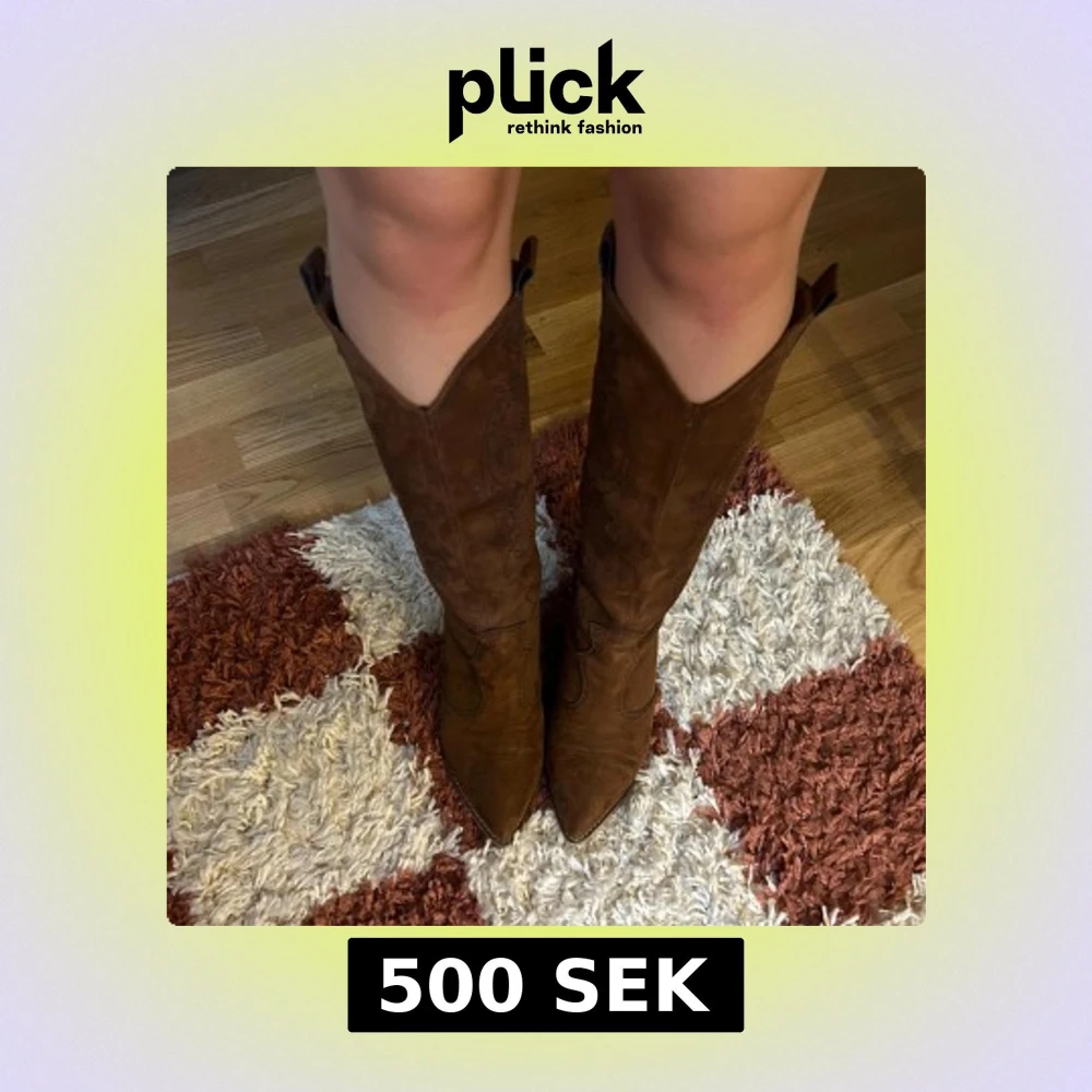 bruna cowboy boots med spetsig tå och låg klack. Bootsens yta är i mocka och har coola broderade detaljer längs skaftet. Storlek 36 men passar mig som vanligtvis köper skor i 37