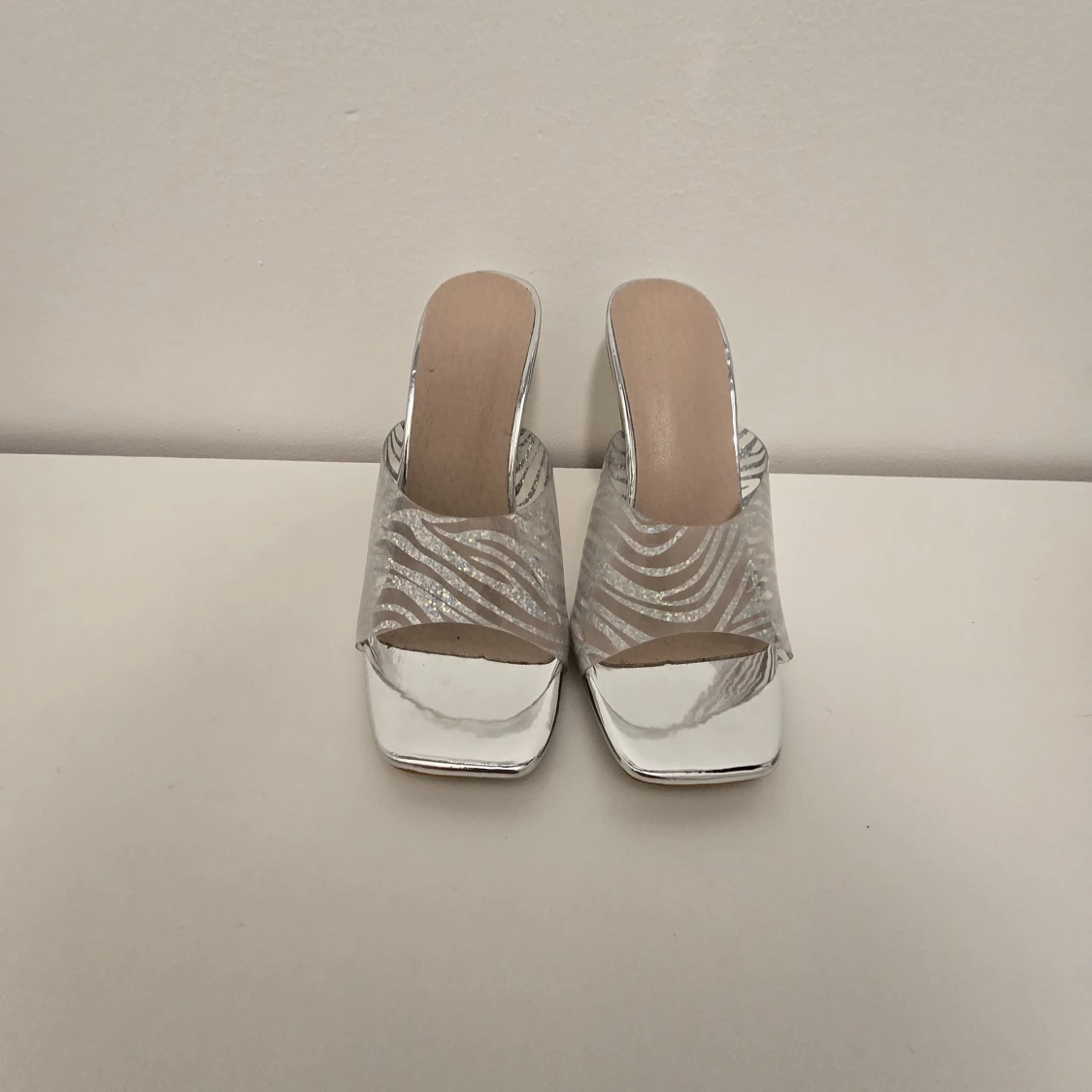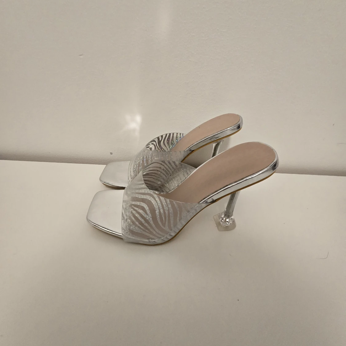 Glammiga silvriga klackar med transparent zebramönstrad rem och fyrkantig tå. Snygg, hög klack och öppen tå ger en trendig vibe. Perfekta för dig som vill sticka ut med metallic och coolt mönster. Materialet är syntet och skon har en plattformslook.
