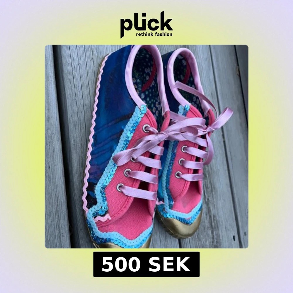 Unika sneakers i blått och rosa med glittriga paljetter, rosa snörning och guldiga tår. Sulan är dekorerad med stjärnmönster och insidan har blommigt tyg. Perfekta för dig som gillar färg och detaljer! Designade i Sevilla, Spanien.