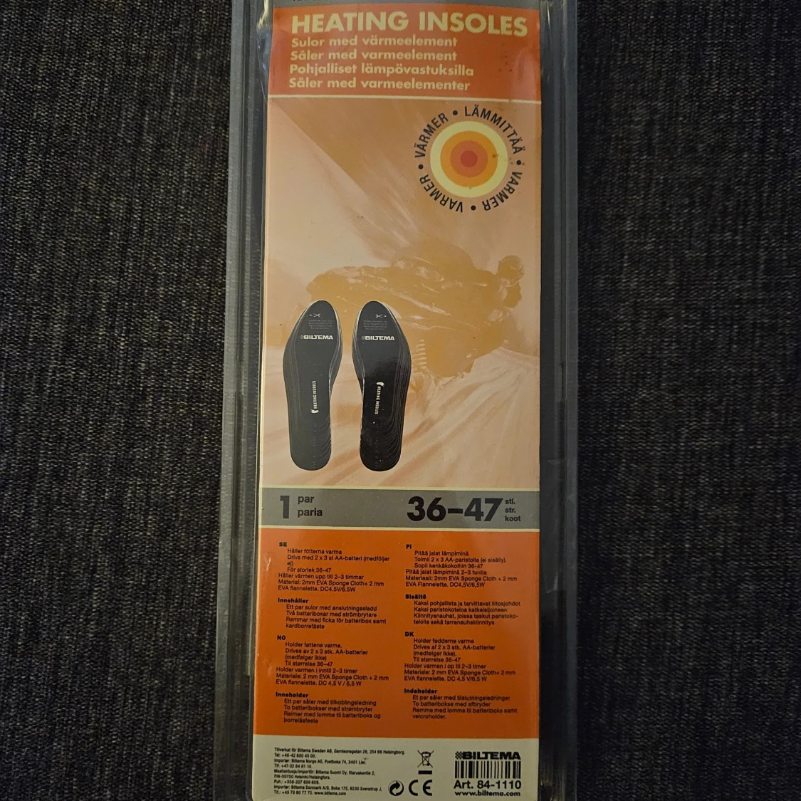 Säljer ett par svarta värmesulor från Biltema som passar storlek 36-47. Sulorna har inbyggda värmeelement och drivs av AA-batterier. Perfekta för kalla dagar och passar i de flesta skor och kängor.