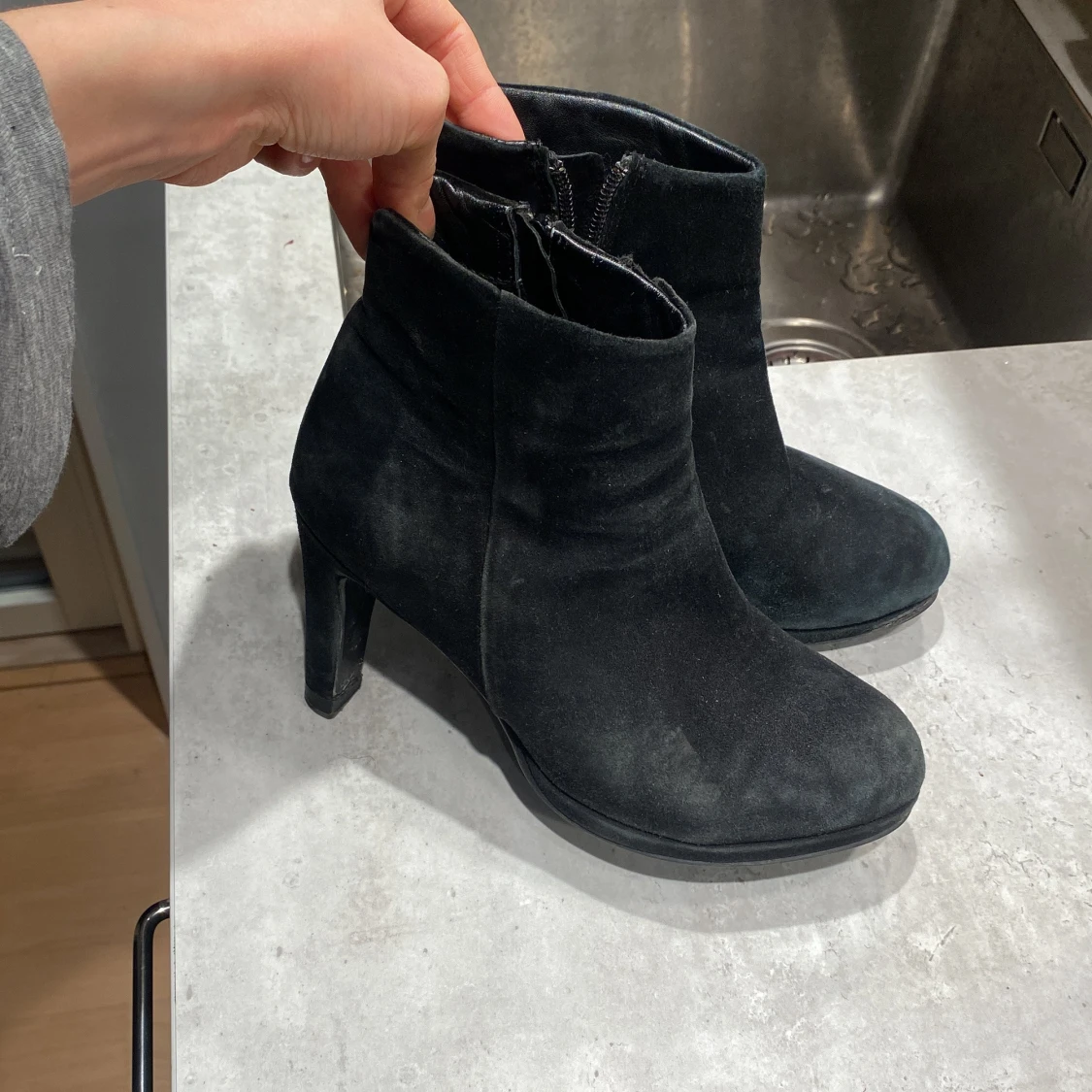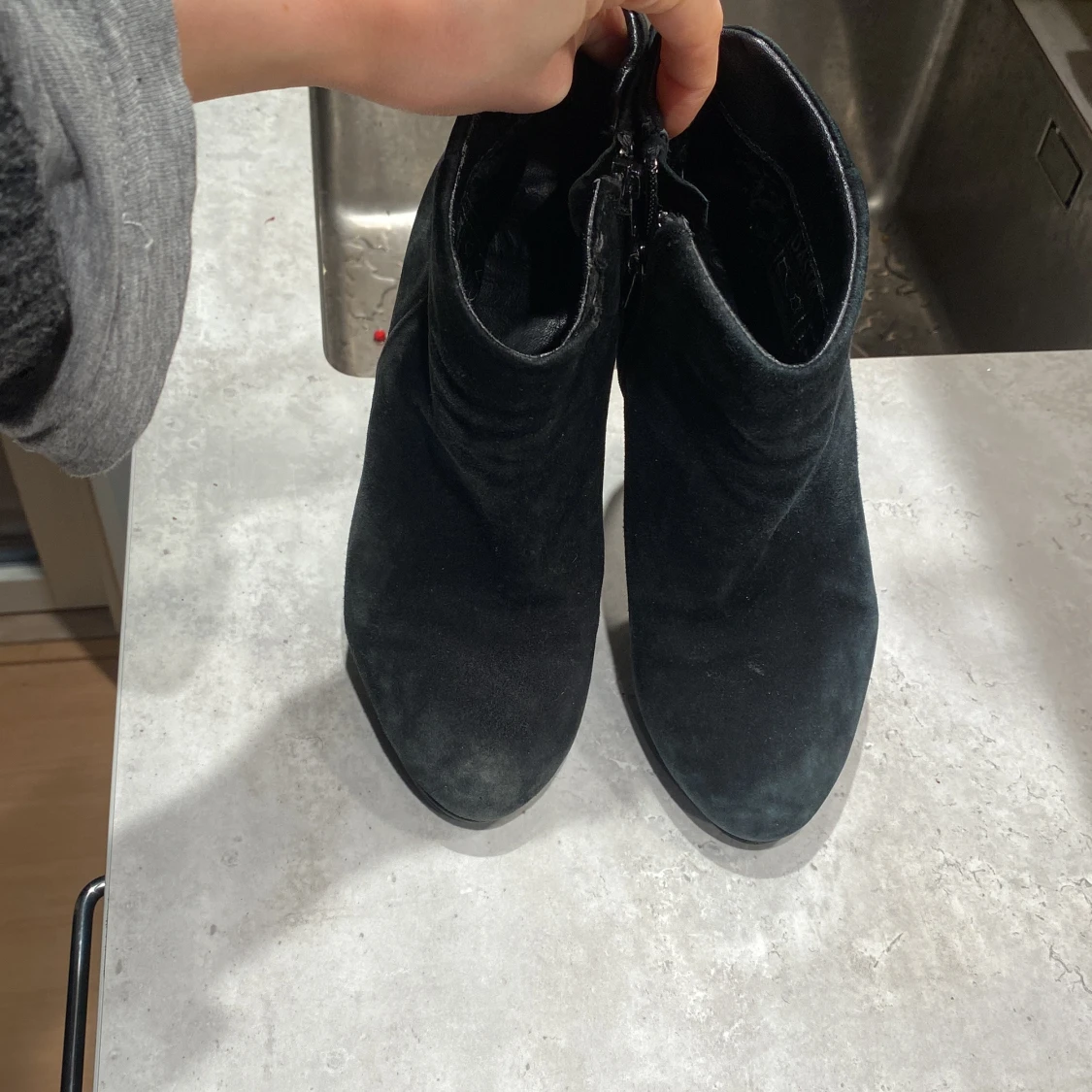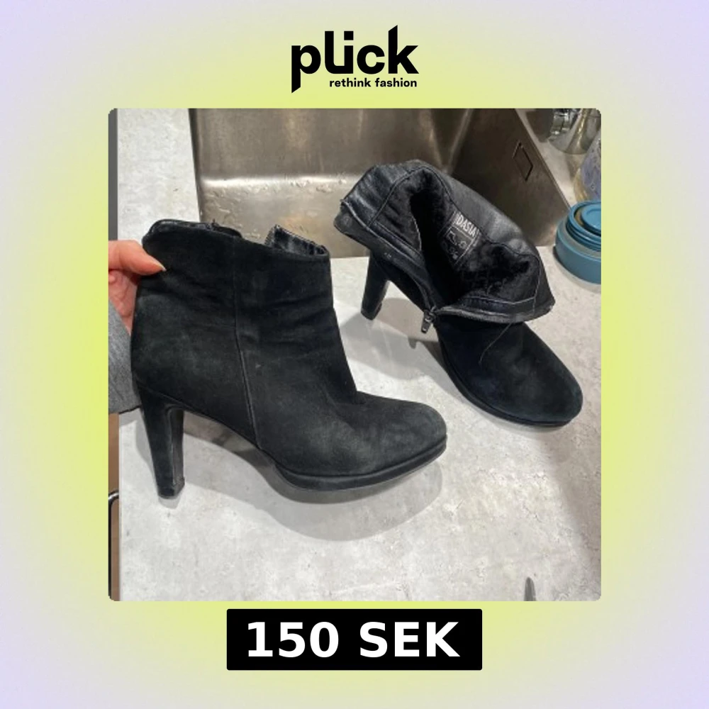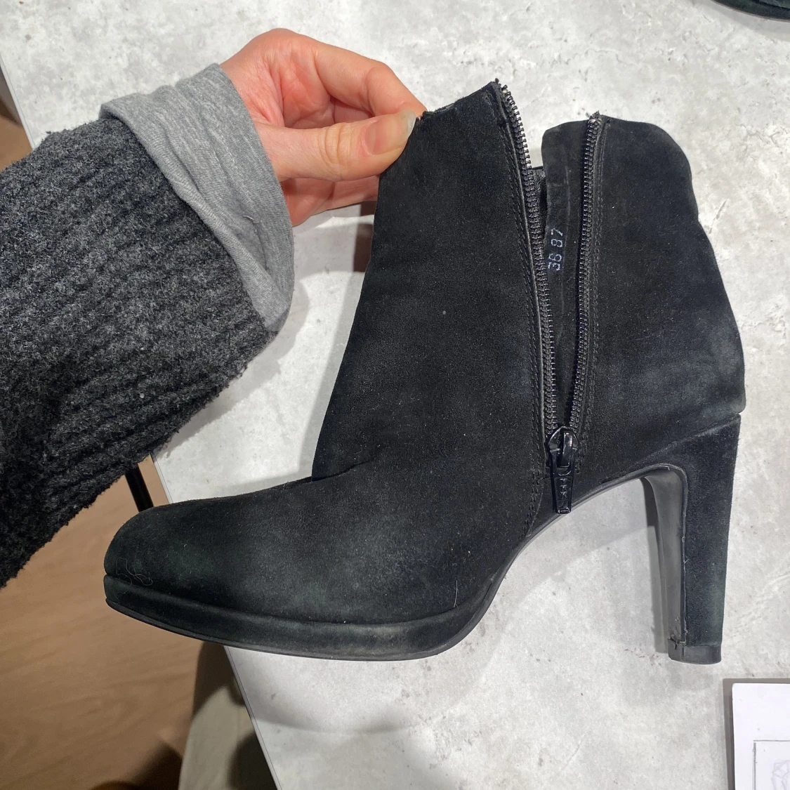 Snygga svarta boots i mocka med klack och dragkedja på sidan. Perfekta för en stilren look.