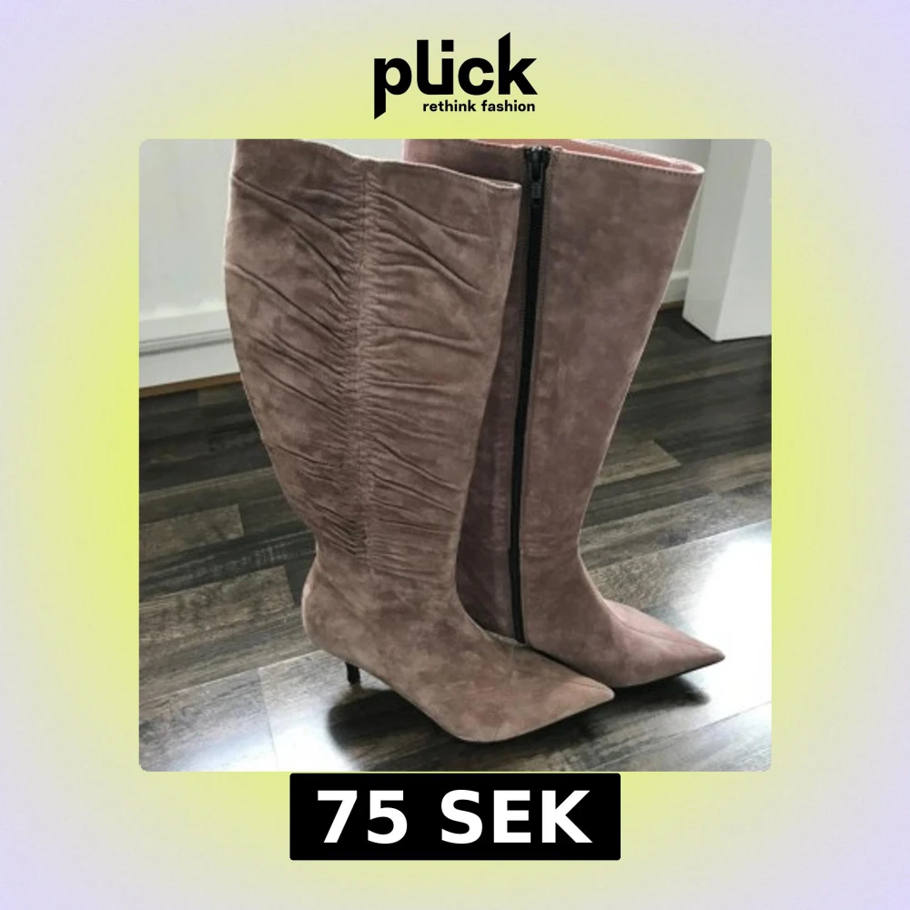 Säljer ett par höga stövlar i beige rosa mocka med snygg rynkad detalj längs skaftet och spetsig tå. Stövlarna har smal klack och dragkedja på insidan för enkel påtagning. Perfekt för dig som gillar stilrena och trendiga boots med lite edge.