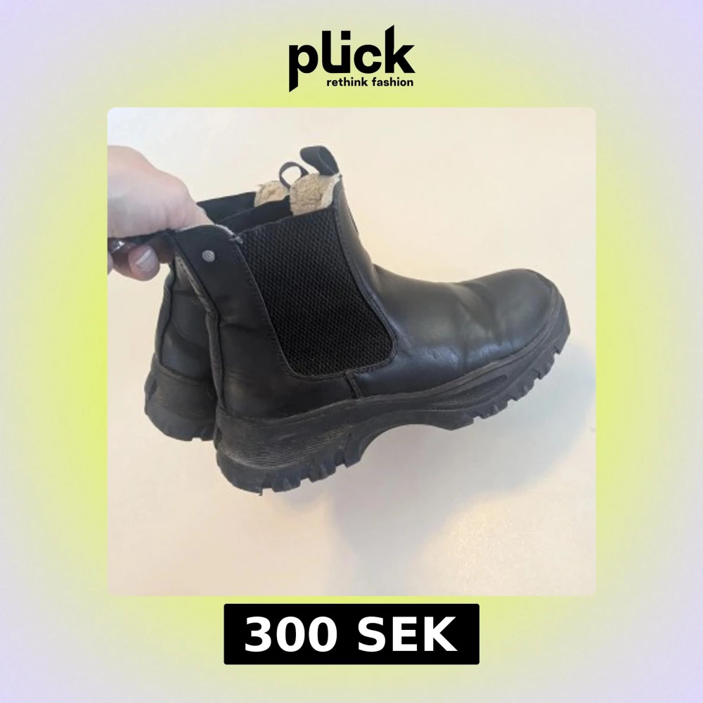 Säljer ett par svarta Chelsea boots med grov sula och elastiska paneler på sidorna. Skorna är fodrade med mjukt foder för extra värme och har dragflikar både fram och bak. Tillverkade i skinn med robust känsla, perfekta för kyligare dagar. Lite skavda fram på tårna men i övrigt bra skick