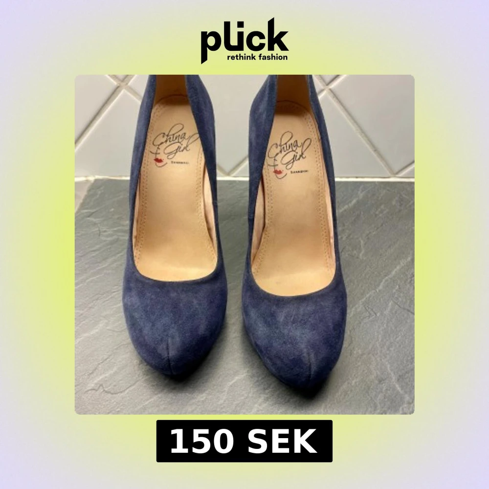 Snygga mörkblå pumps i mocka från China Girl. Skorna har hög klack och rund tå, med en beige detalj längs hälen och logga i guld. Perfekta för dig som vill sticka ut med klassisk stil och en modern twist.