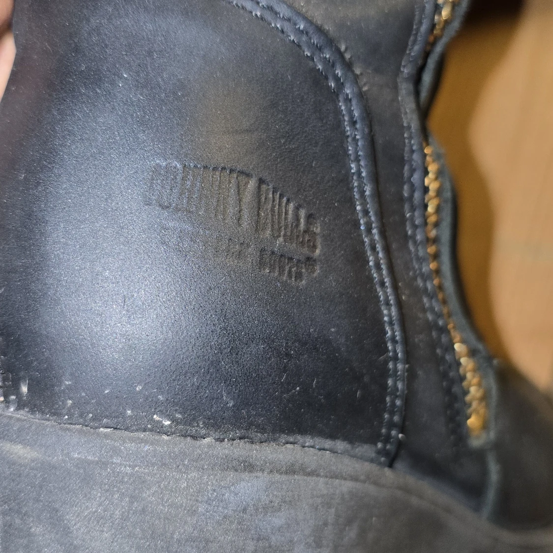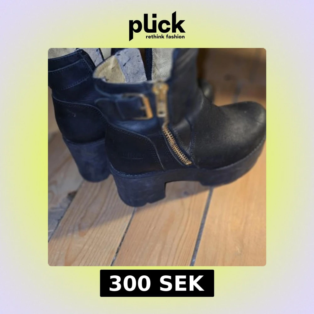 Säljer ett par svarta boots från Johnny Bulls med grov klack, dragkedja i guld och spänne vid skaftet. Skorna är i skinn och har en robust, chunky sula som ger en cool look. Perfekta för dig som gillar en tuffare stil.