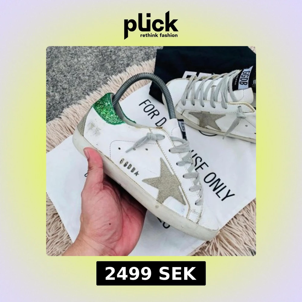 Snygga GGDB sneakers i vitt med gröna glittriga detaljer på hälen och en stjärna på sidan. Skorna har grå snörning och en klassisk design med svart sula. Perfekta för en trendig look.