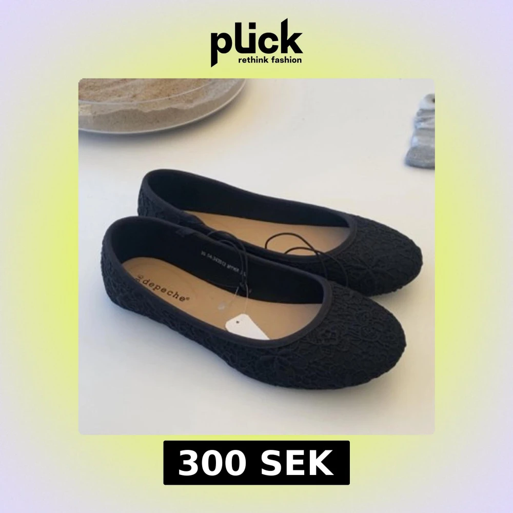 Säljer ett par svarta ballerinaskor från Depeche med vackert spetsmönster. Skorna har rund tå och platt sula, perfekta för en stilren och enkel look. Passar till många olika outfits och är lätta att bära. Helt nya med prislapp kvar