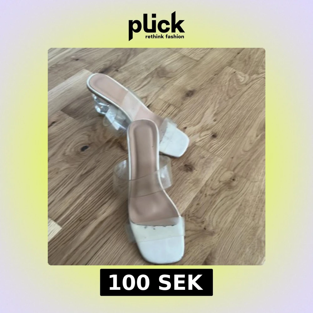 Säljer ett par trendiga vita klackskor med transparenta remmar och fyrkantig tå. Skorna har en genomskinlig klack som ger en modern look. Perfekta för dig som vill sticka ut med en stilren.