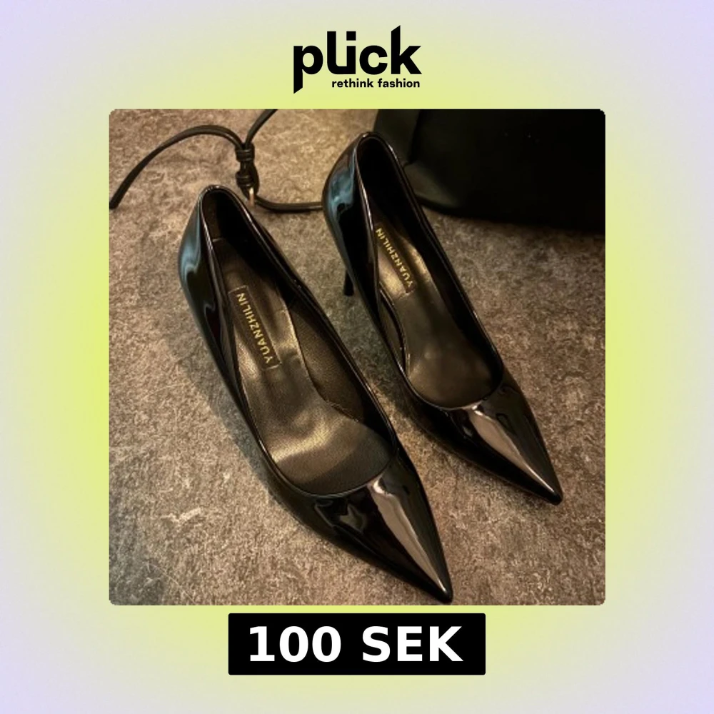 Säljer ett par svarta pumps från YUANZHILIN i glansigt lackmaterial. Skorna har spetsig tå och smal hög klack som ger en elegant siluett. Perfekta för dig som vill sticka ut med en klassisk och stilren look.