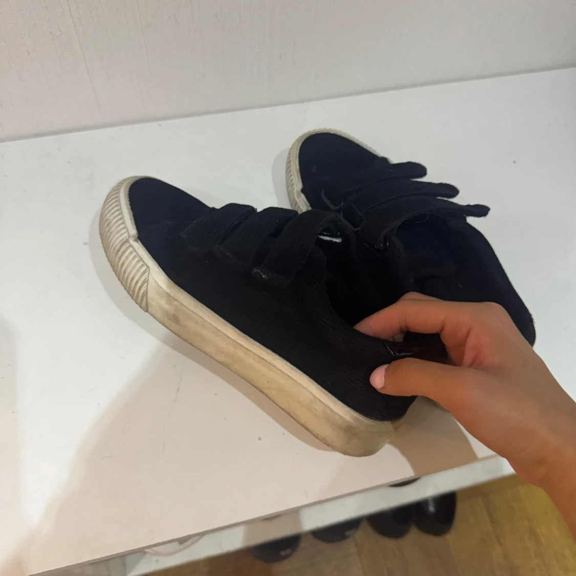Svarta sneakers i manchestertyg med tre breda kardborreband och vit, räfflad gummisula.