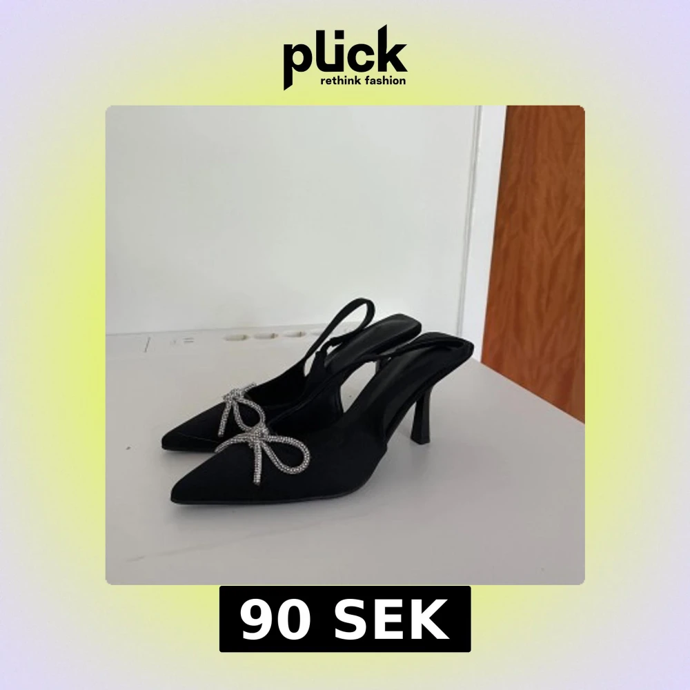 Stilrena svarta pumps med spetsig tå och hög klack. Skorna har en elegant glittrig rosett framtill och öppen häl med rem. Helt oanvända