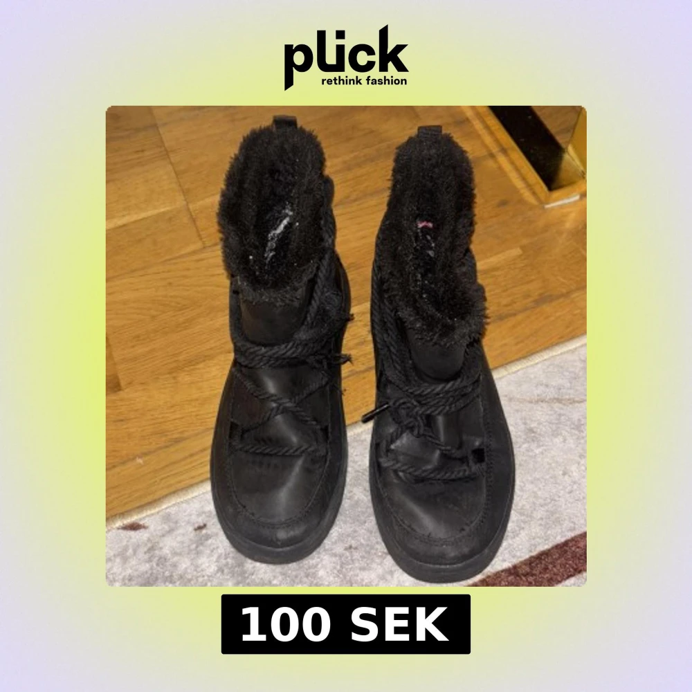 Säljer ett par svarta moon boots med grov platt sula och snörning framtill. Insidan är fodrad med mjukt, fluffigt material som håller fötterna varma. Yttermaterialet är syntet och designen är chunky med rund tå. Perfekt för kalla vinterdagar.