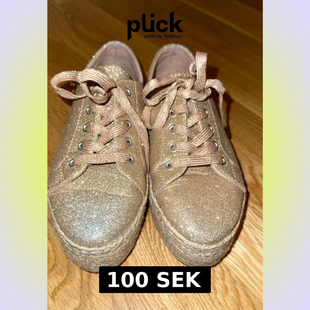 Säljer ett par snygga sneakers i guld med glittrigt tyg och grov platåsula i repimitation. Skorna har snörning och rund tå, perfekt för dig som vill sticka ut med lite extra höjd och shimmer. Storlek 36.