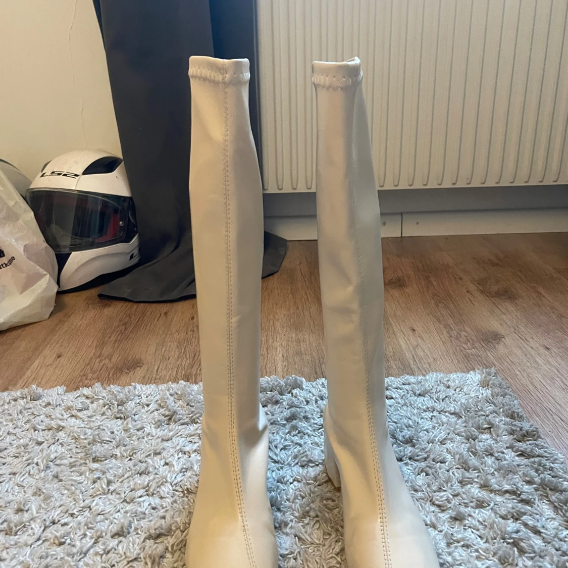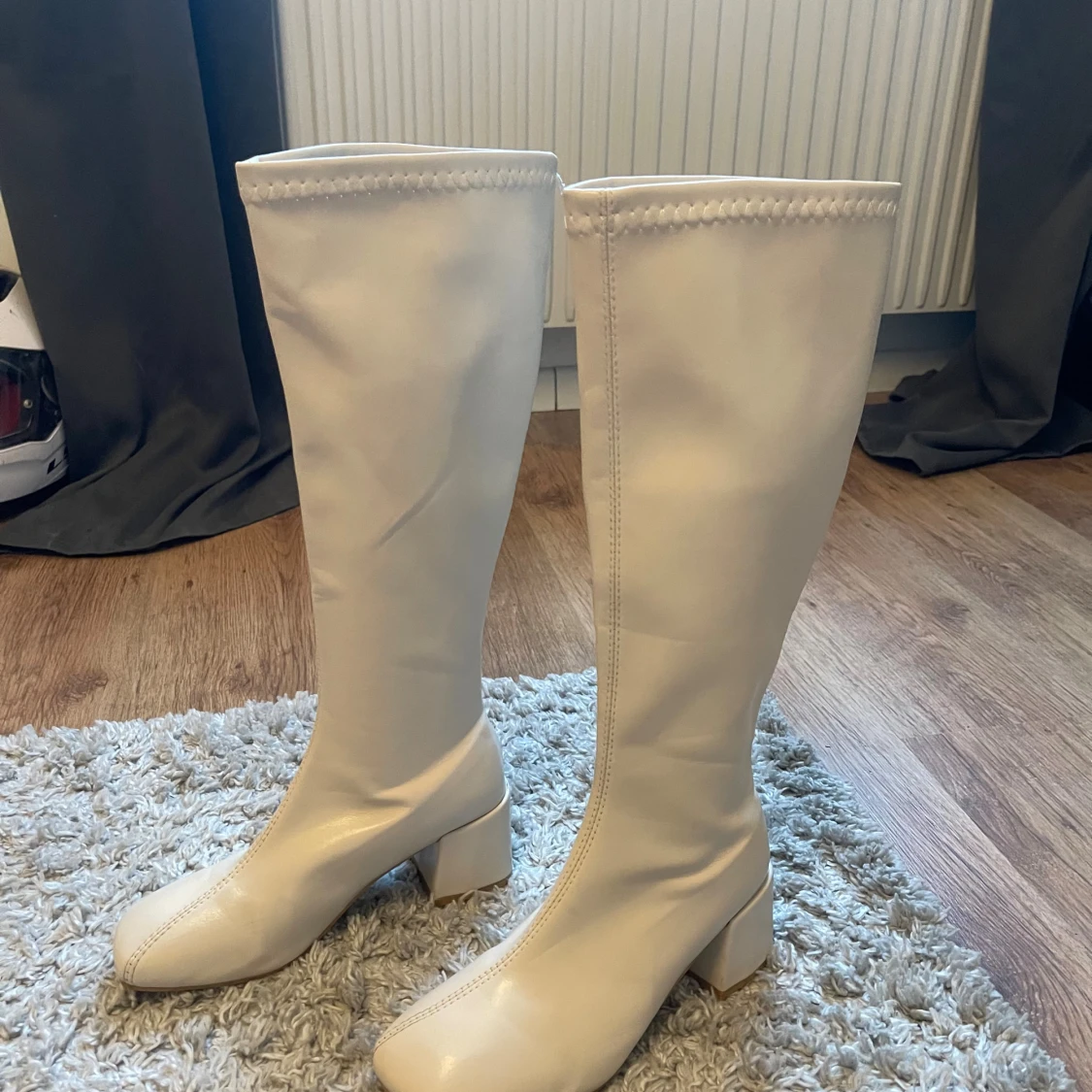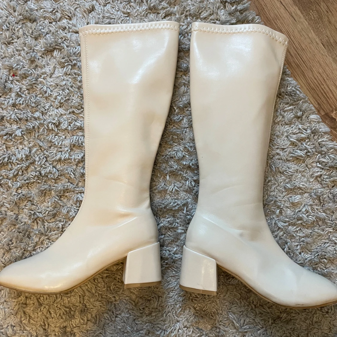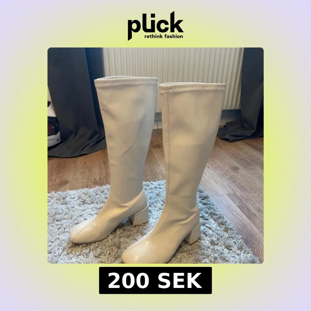 Säljer ett par vita boots med blockklack och rund tå. Skorna är höga och har en stilren design med dekorativ söm upptill. Materialet är slätt syntet som ger en modern look. Perfekta för dig som vill sticka ut med ett par statement boots. Jag tror att de är ifrån din sko, skopunkten eller något sånt💕