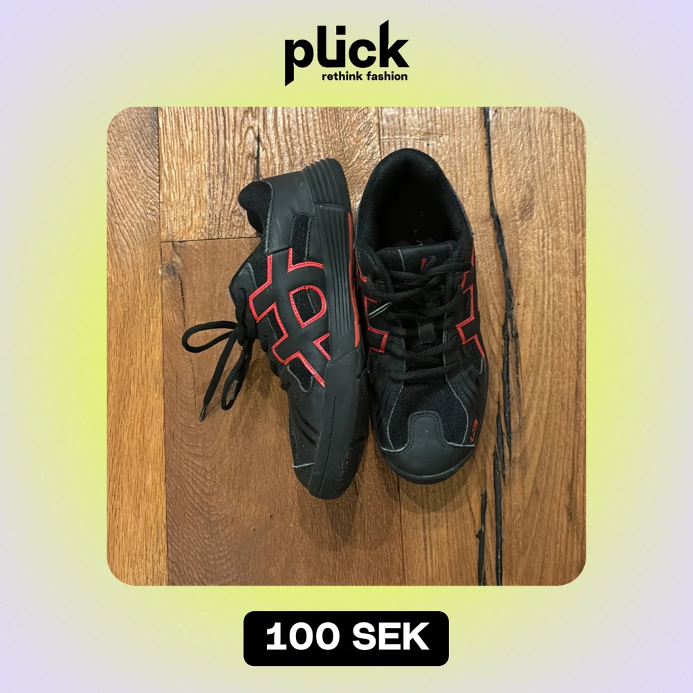 Säljer ett par coola svarta sneakers från Unihoc med röda detaljer. Skorna har snörning och är i syntetmaterial, perfekt för inomhussporter. De är i bra skick och redo för nya äventyr. Passar perfekt för träning eller vardagsbruk!