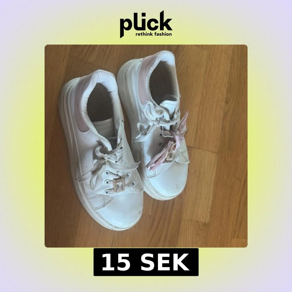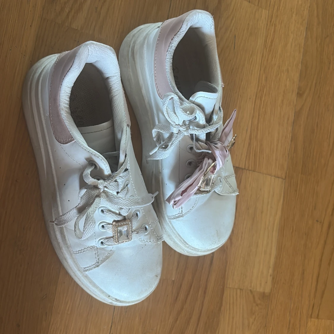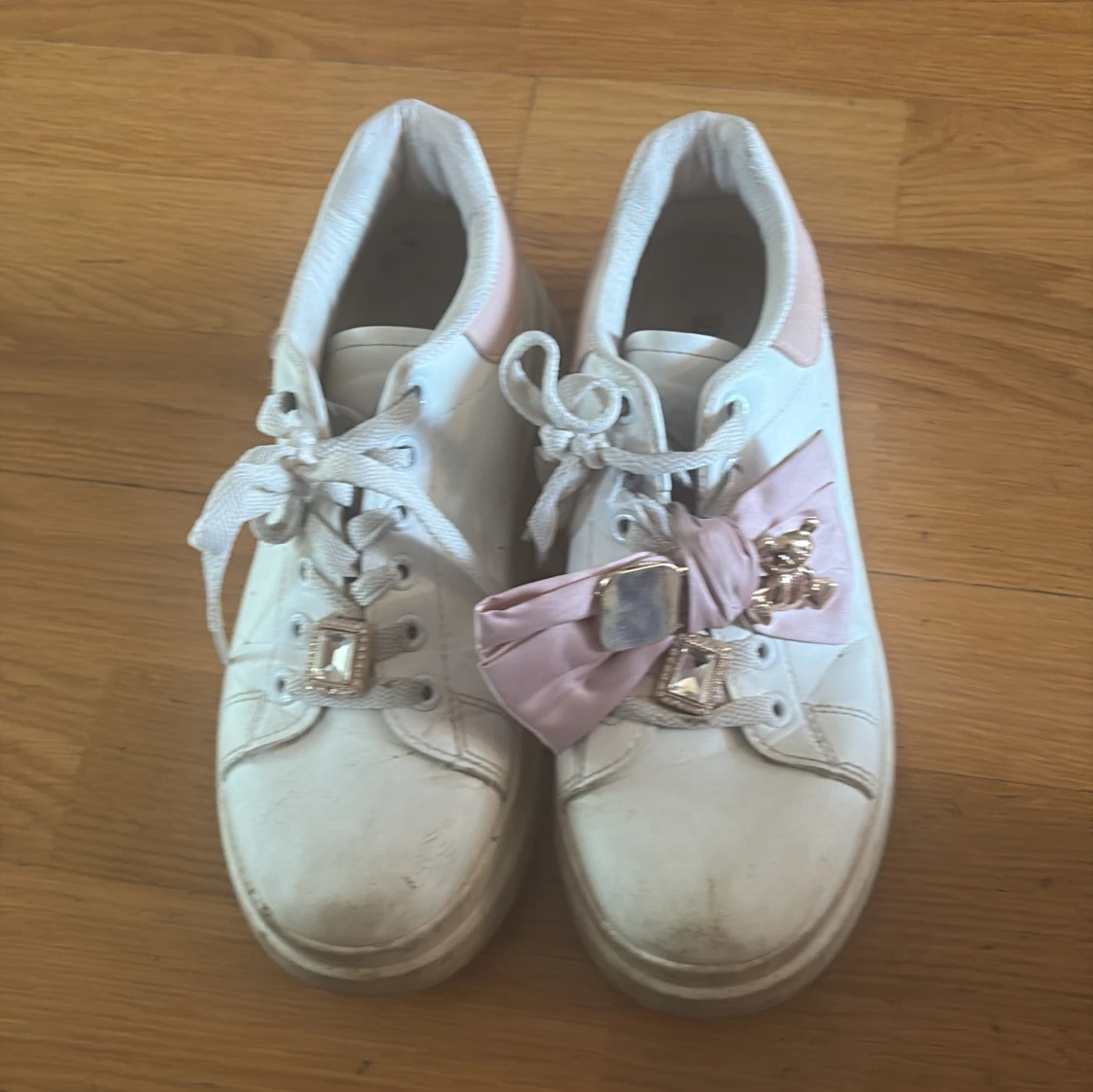 Chunky vita sneakers med ljusrosa detaljer vid hälen och coola smycken på snörningen. Ena skon har en stor rosa rosett och dekorativa stenar som ger extra bling. Perfekta för dig som vill sticka ut med din stil.