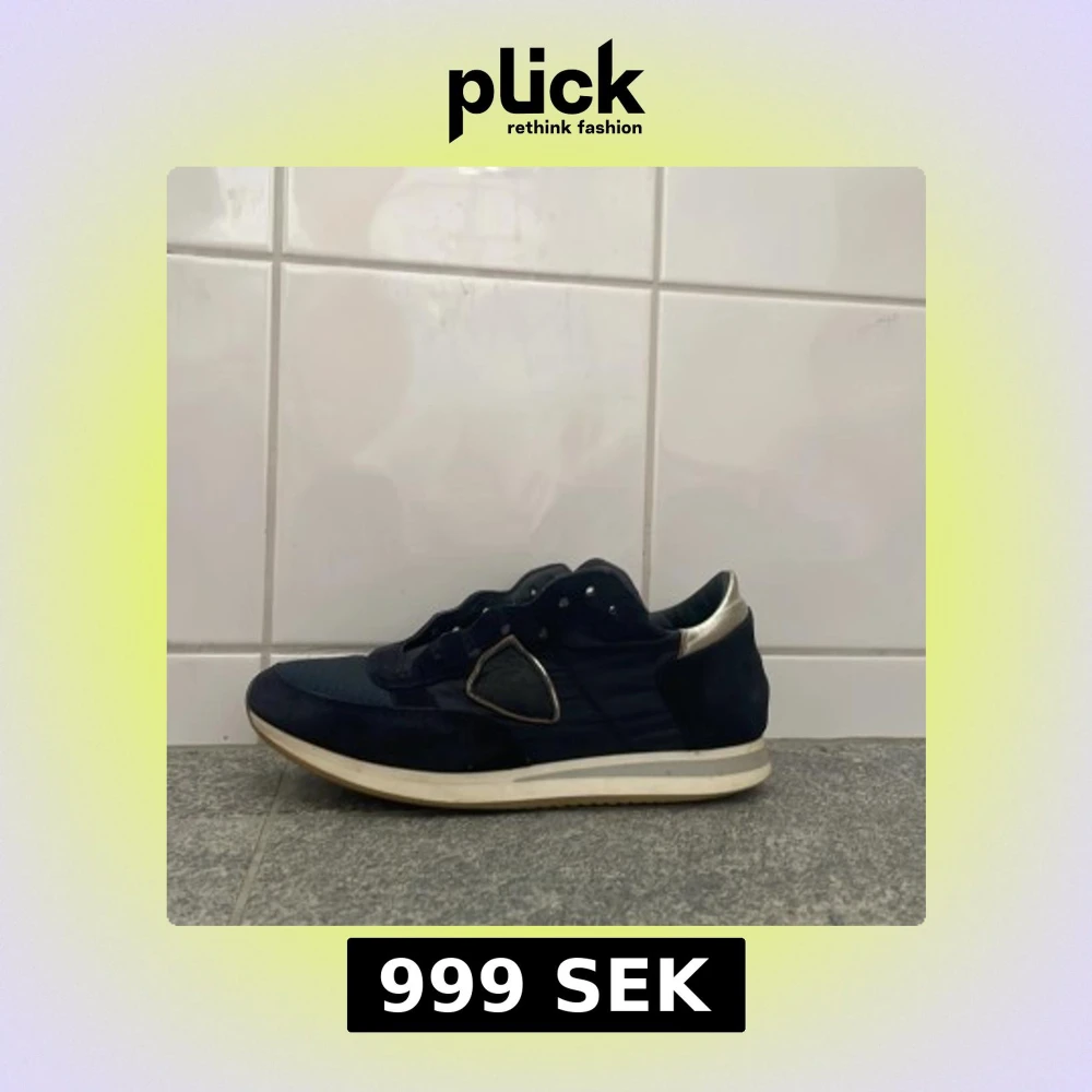 Man får också med ett par skosnören till dom.dom är 36 men passar mig med 38 Snygga mörkblå sneakers med en vit sula och silverdetaljer vid hälen. Skorna har snörning och en stilren design som passar perfekt för en casual look.