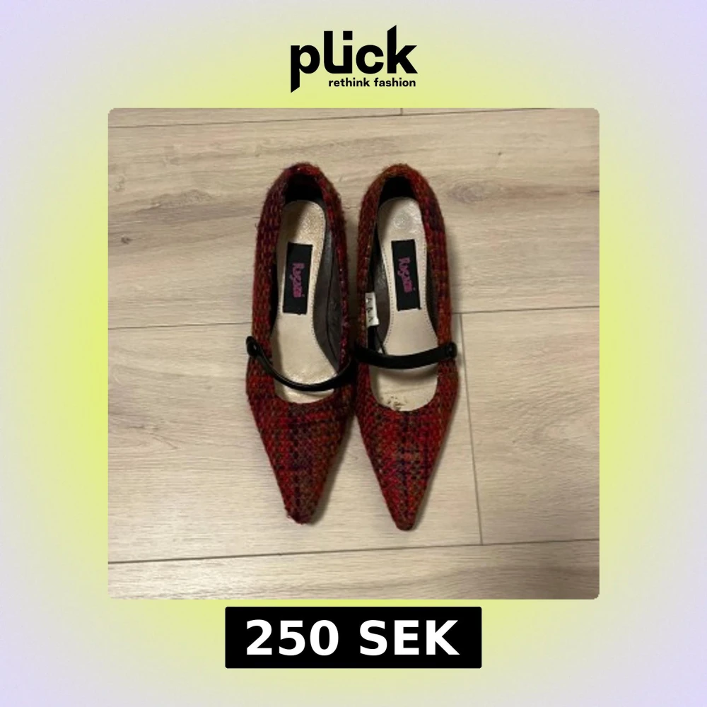 Snygga röda klackar med spetsig tå från Raye. Skorna har ett unikt rutigt mönster och en dekorativ svart rem över foten. Perfekta för att ge en färgklick till din outfit.