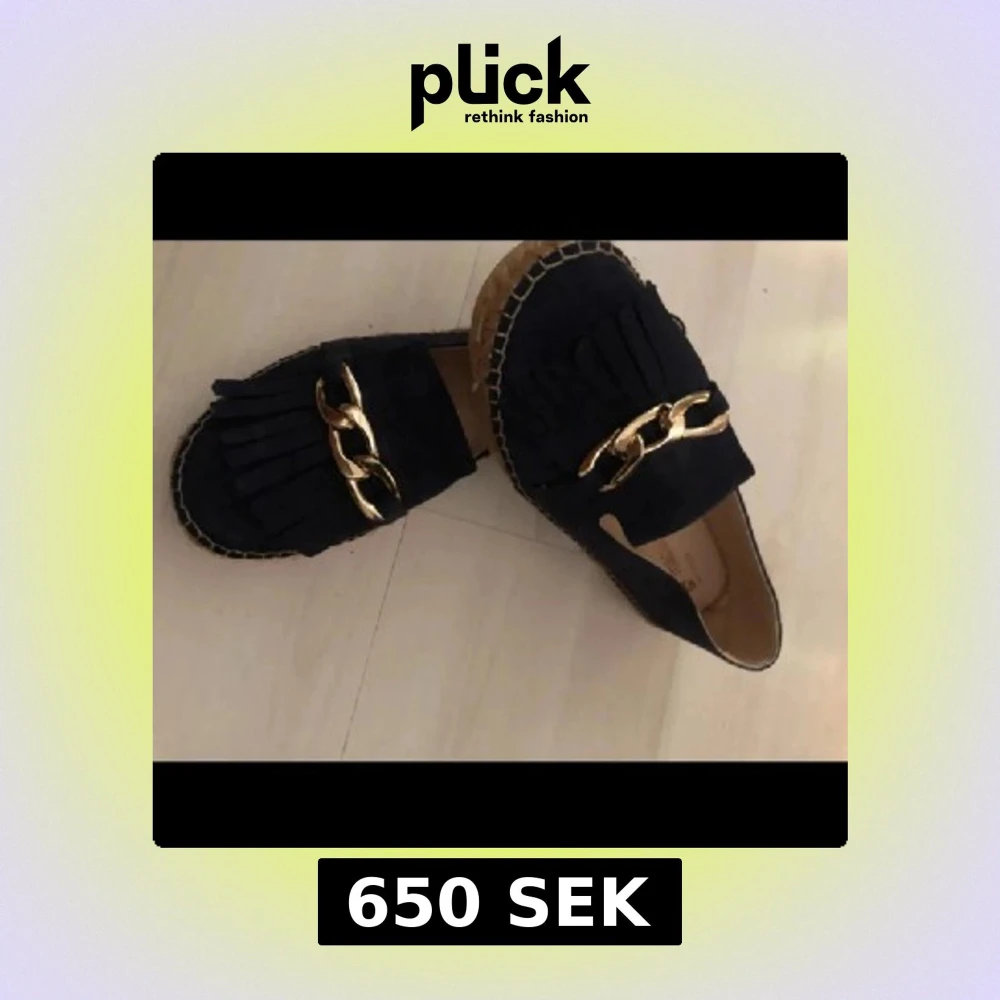 Snygga mörkblå loafers med mockayta och dekorativ guldfärgad kedja framtill. Skorna har fransdetaljer och en platt sula med ljus kant. Perfekta för dig som gillar stilrena och trendiga detaljer. Mocka skinn
