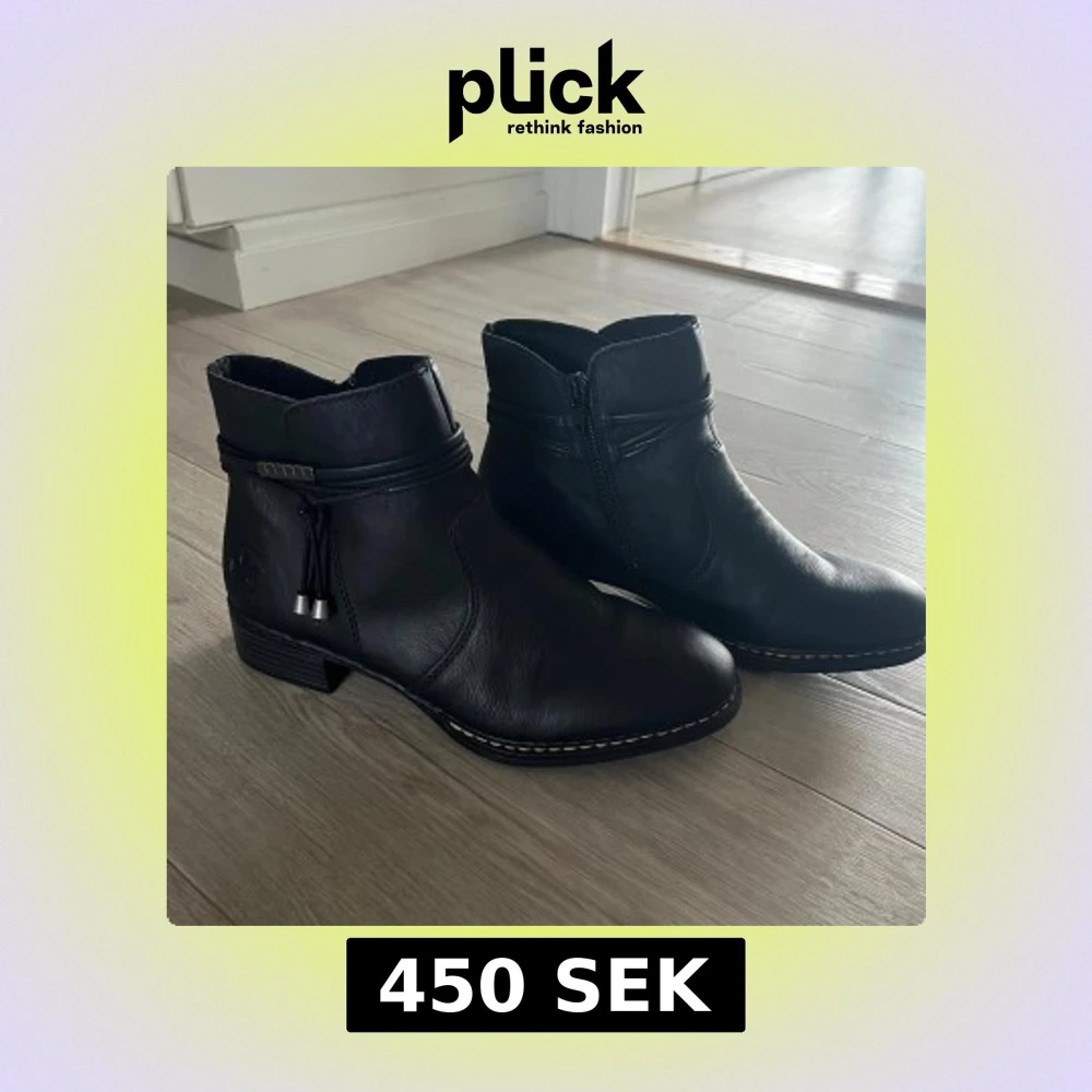 Snygga svarta boots från Rieker i skinn med mjukt foder på insidan. Skorna har rund tå, låg klack och dragkedja på sidan. Dekorativa detaljer runt skaftet och robust platt sula med Rieker-logga undertill. Aldrig använda endast testade