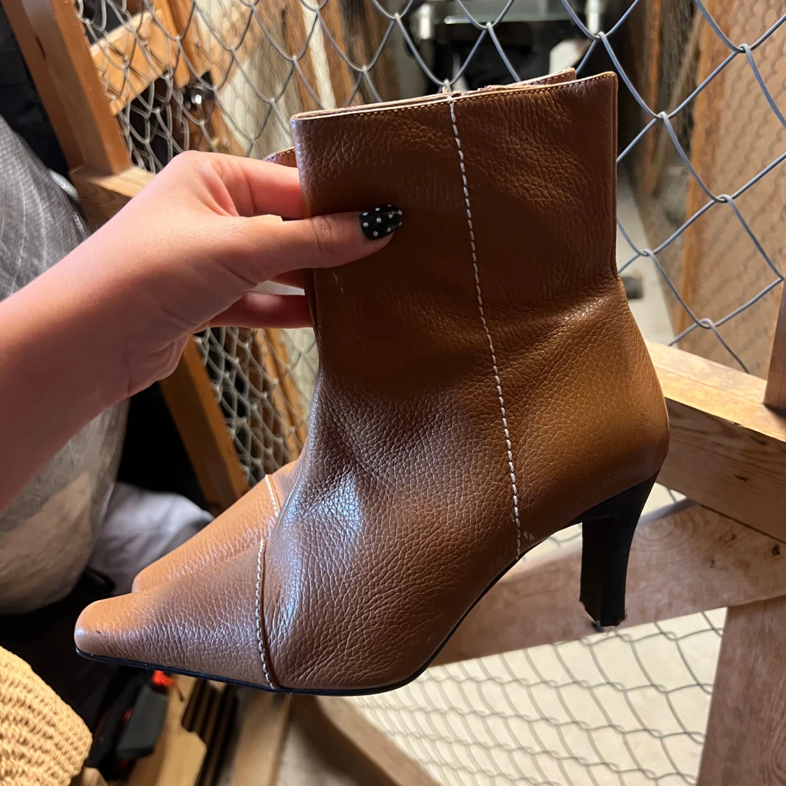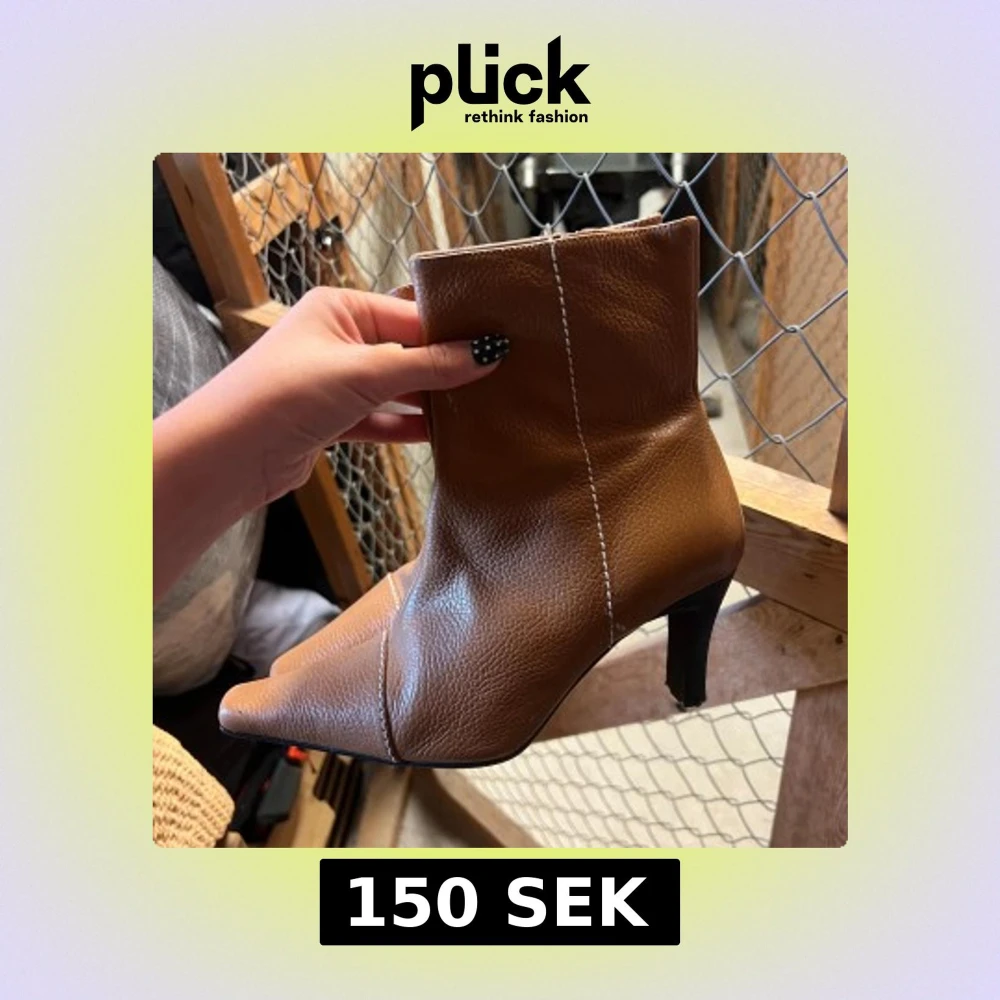 Bruna stövletter i skinn med markerad vit söm och spetsig tå. Modellen har en smal hög klack. Storlek 39, men passar mig som har 37/38. Klacken kan behövas klackas om. Köpt begagnade för 499kr