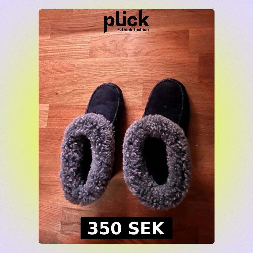 Mysiga mörkblå tofflor med fluffigt grått foder runt öppningen. Tofflorna har en enkel design med rund tå och är perfekta för att hålla fötterna varma hemma. Materialet ser ut att vara syntet eller fleece för extra komfort.