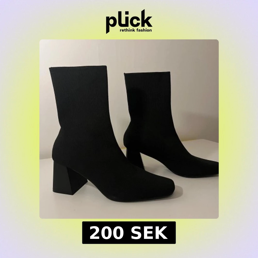 Säljer ett par svarta boots med stretchigt tyg och bred klack. Skorna har en minimalistisk design med rund tå och är perfekta för dig som gillar stilrena och moderna skor.