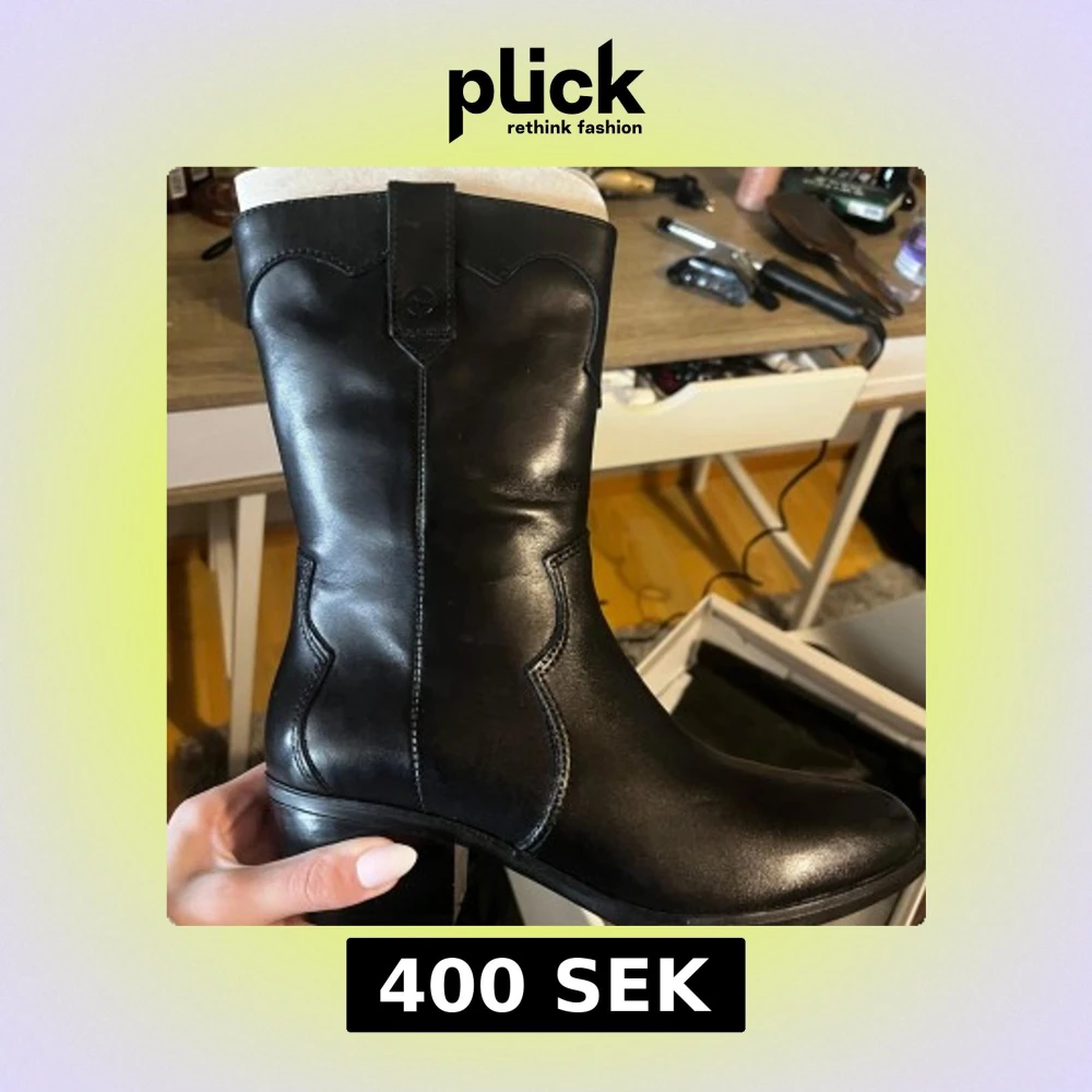 Säljer ett par svarta boots i skinn med låg klack och dekorativa sömmar. Skorna har dragkedja på insidan och en klassisk rund tå. Perfekta för dig som vill ha en stilren och tidlös look.