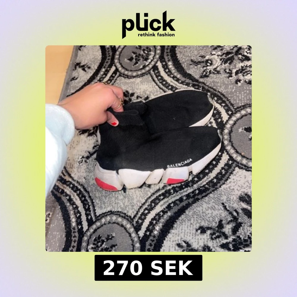 Säljer ett par svarta sneakers med vit och röd sula. Skorna har en strumpliknande design utan snörning, vilket ger en modern och stilren look. Perfekta för dig som vill ha både komfort och stil.