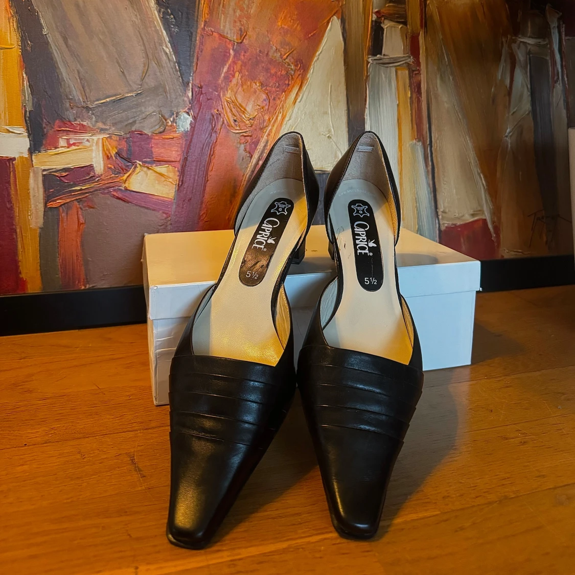 Säljer ett par eleganta svarta pumps från Caprice. De har en spetsig tå och en låg klack, vilket gör dem både stiliga och bekväma. Perfekta för både vardag och fest!