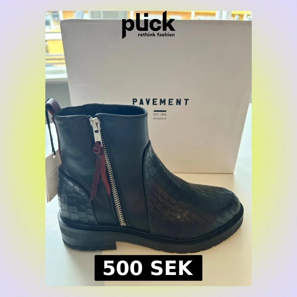 Snygga svarta boots från Pavement i skinn med coolt ormskinnsmönster och silverfärgad dragkedja på sidan. Skorna har rund tå, platt sula och en mörkröd detalj vid dragkedjan.