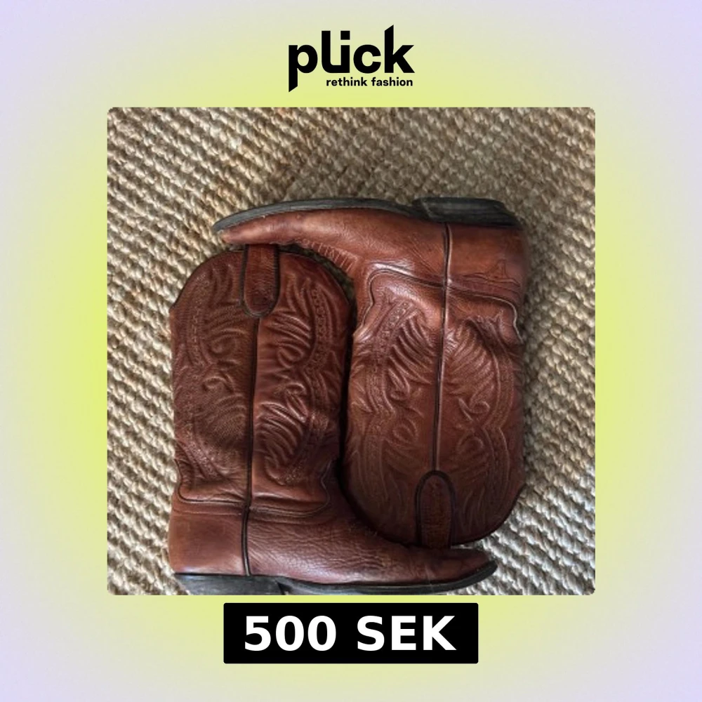 Vintage cowboyboots, köpta för ca 1 år sedan och inlämnade hos skomakare nyligen för att limma om sulan. Lite slitna (se mindre fläckar på tårna och slitningar på klacken) men annars i gott skick.