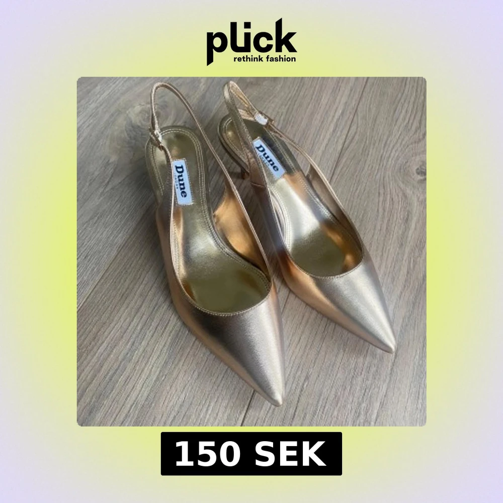 Säljer ett par pumps i guld från Dune med spetsig tå och låg klack. Skorna har öppen häl med justerbart spänne och glansig finish. Endast testade🩷