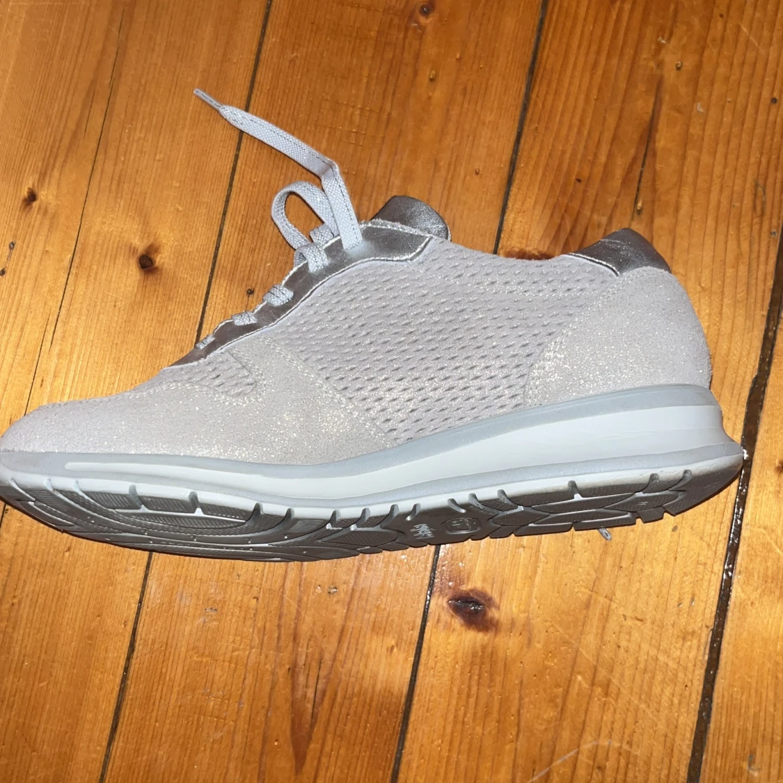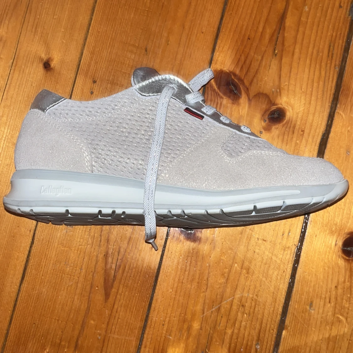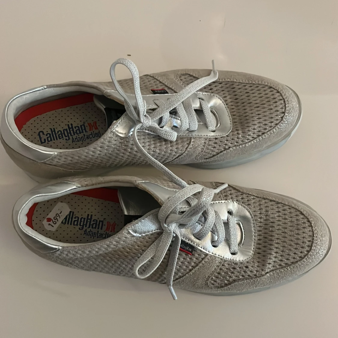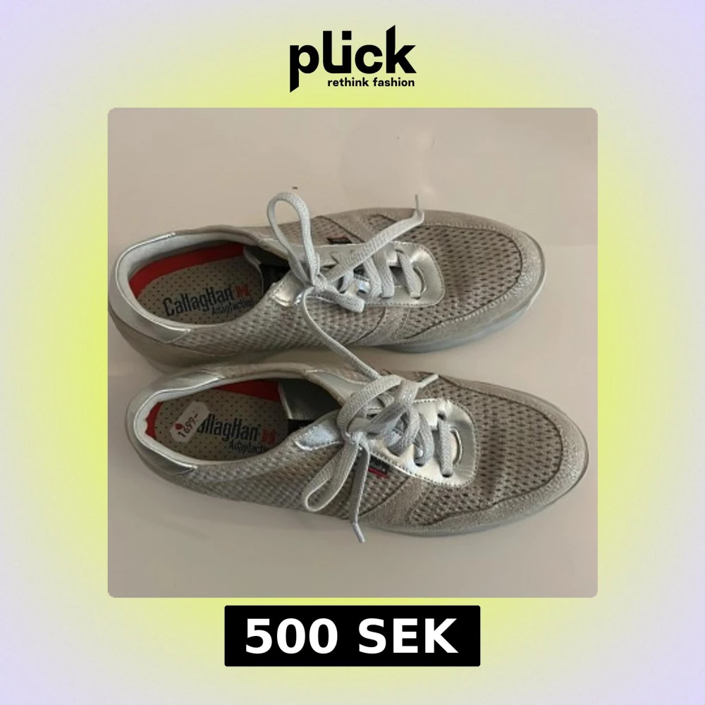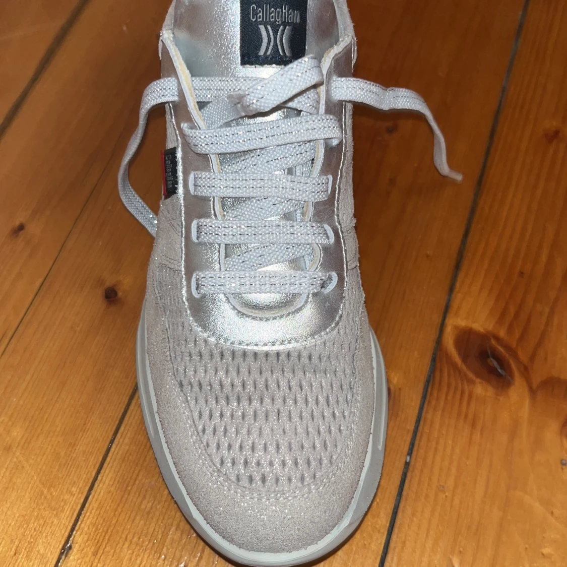 Säljer ett par snygga silvriga sneakers från Callaghan med meshad ovandel och metallic-detaljer. Skorna har snörning, platt sula och rund tå. Insidan är vadderad för extra komfort och yttermaterialet är en mix av syntet och skinn. Perfekt för dig som gillar stilrena och moderna sneakers.
