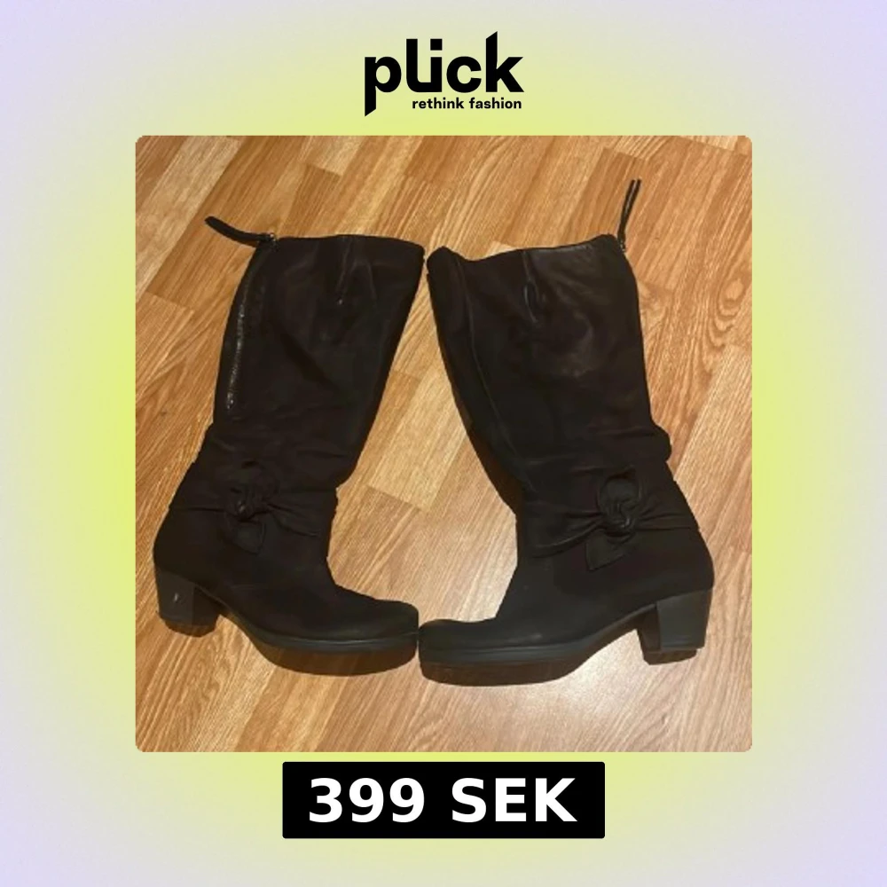 Snygga svarta stövlar i mocka med dekorativ rosett vid ankeln och dragkedja på insidan. De har en låg klack och rund tå, vilket gör dem både stilrena och bekväma. Perfekta för dig som vill ha en klassisk look med en twist.