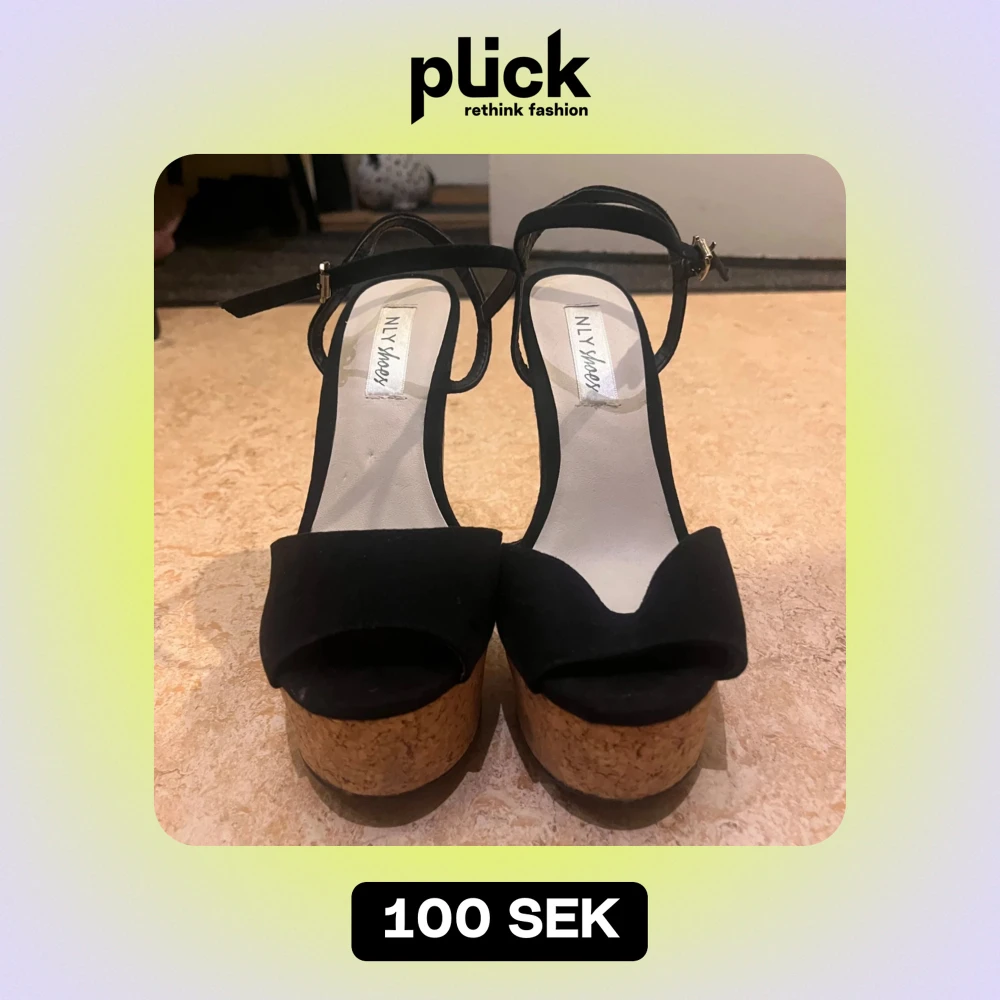 Snygga svarta platåsandaler från NLY Shoes med korkklack. De har en öppen tå och justerbar rem runt ankeln. Perfekta för sommarens fester eller en utekväll. Klacken ger extra höjd och stil.