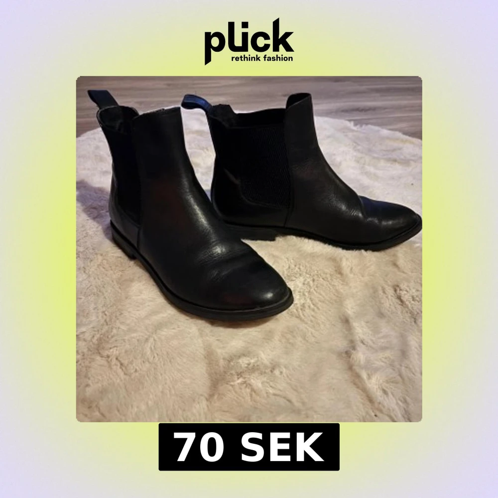 Snygga svarta chelsea boots med rund tå och platt sula. Bootsens ovandel är i slätt skinn och har elastiska paneler på sidorna för enkel på- och avtagning. Klassisk siluett med dragflik bak och låg klack, perfekta för en stilren look.