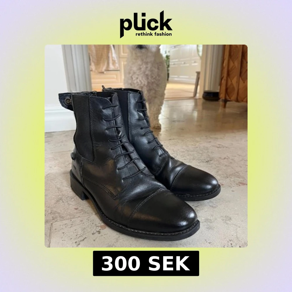 Fina låga svarta ridskor. Bra skick men en skada bredvid dragkedjan som syns på bild två.