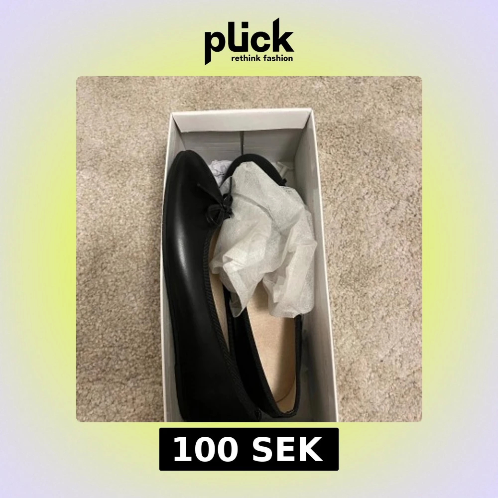 Stilrena svarta ballerinaskor med rund tå och liten rosett framtill. Skorna har en platt sula och är tillverkade i ett slätt material som ger en klassisk look. Dom är oanvända alltså i nytt skick