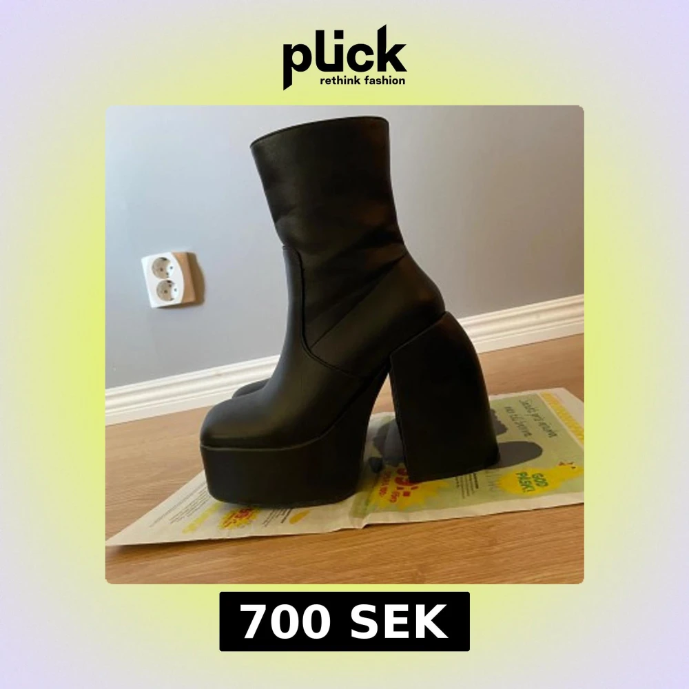Säljer ett par riktigt snygga svarta boots med rejäl klack. Perfekta för dig som vill sticka ut och få extra höjd. Bara använt ett fåtal gånger, ca 5 gånger skulle jag gissa.