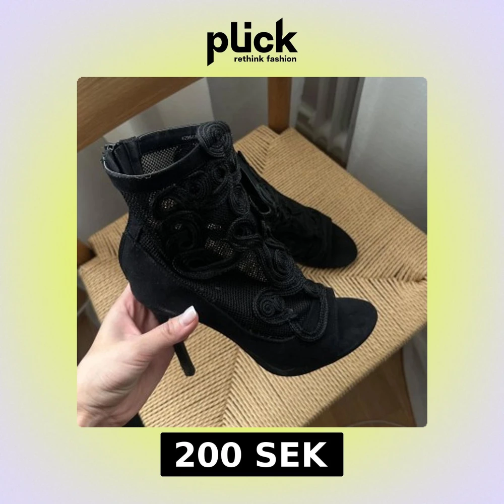 Eleganta svarta boots med spetsig tå och spetsdetaljer detaljer. Skorna har en dragkedja baktill. Använda en gång, som nya och inga defekter😊