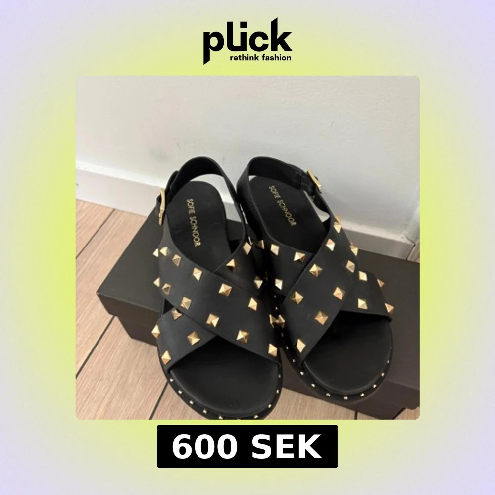 Svarta sandaler från Sofie Schnoor med breda korslagda remmar och coola guldiga nitar över hela skon. Justerbart spänne i sidan och platt sula. Tillverkade i skinn för en lyxig känsla och edgy look. Inköpta för 1200kr