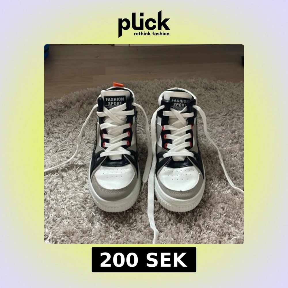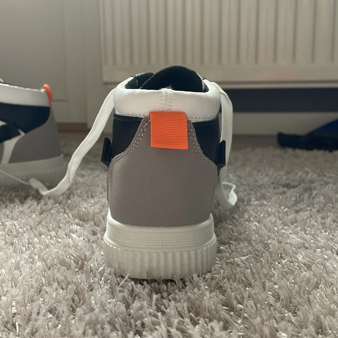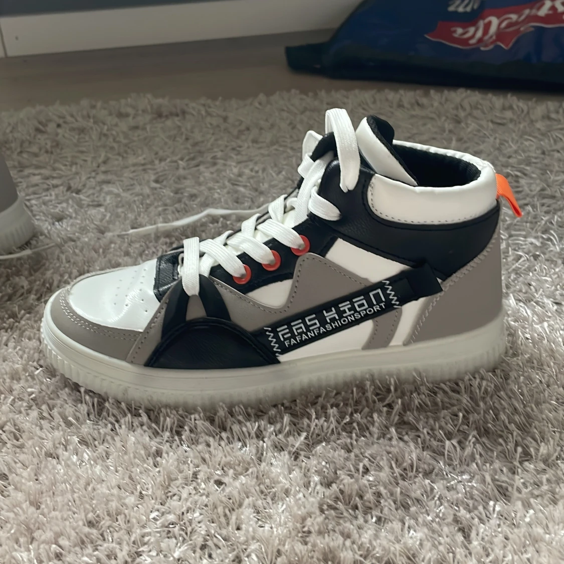 Snygga sneakers i svart, vitt och grått med coola detaljer och orange flärp bak. Skorna har snörning med röda öglor och en chunky vit sula. Materialet är syntet och designen är modern med kontrasterande paneler. Perfekta för dig som gillar streetstyle.