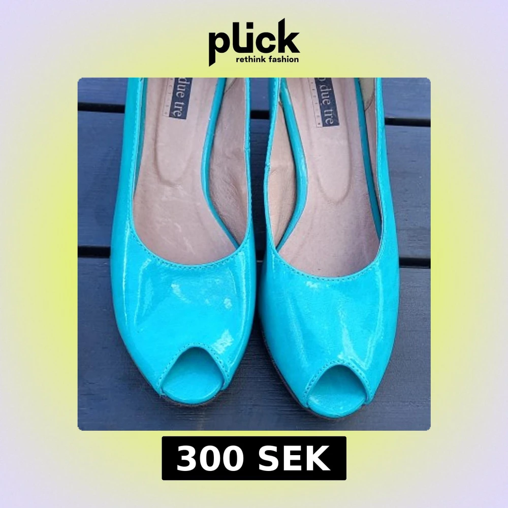 Snygga turkosa pumps från Uno Due Tre med lackad finish och öppen tå. Skorna har en stabil, låg klack i trälook och rundad form framtill. Klacken är ca 6 cm. Perfekta för dig som vill sticka ut med färg och stil. Bekväm innersula och platt yttersula för extra komfort.