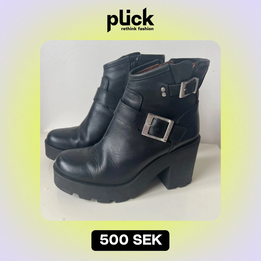 Snygga svarta boots i skinn med hög klack och coola spännen på sidan. Perfekta för höst och vinter, och ger en edgy touch till vilken outfit som helst. De har en dragkedja på insidan för enkel på- och avtagning. Använda fåtal gånger men i väldigt bra skick!
