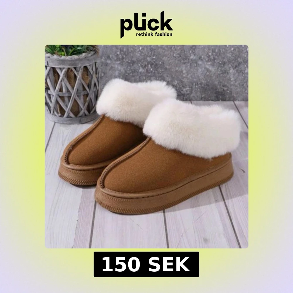 Mysiga bruna boots med fluffig vit pälskant. Skorna har en platt sula med mjuk päls runt öppningen. Perfekta för kalla dagar när du vill hålla fötterna varma och snygga.