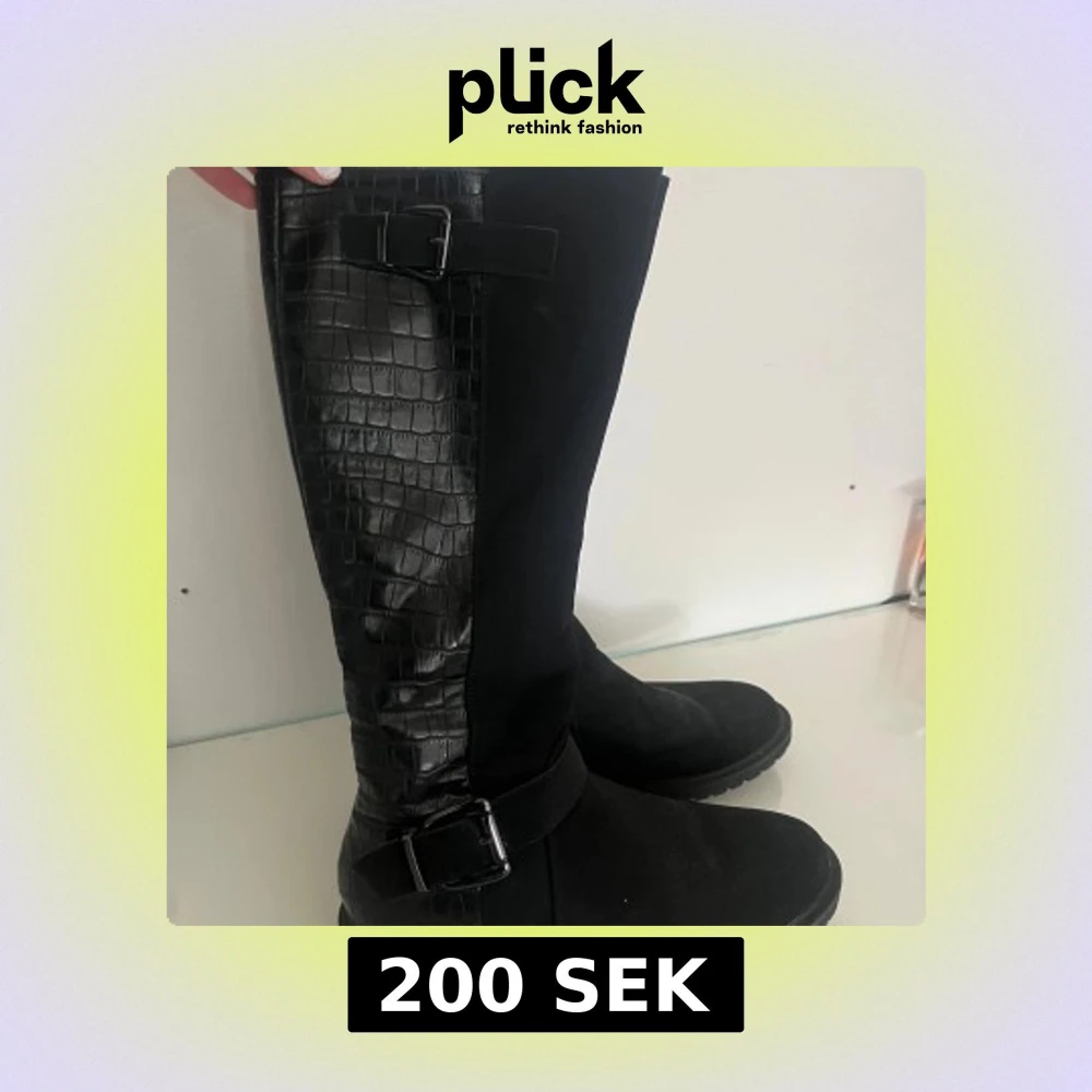 Säljer ett par svarta höga boots med snygga krokodilmönstrade detaljer på skaftet och två dekorativa spännen. Bootsens framsida är i slät mockaliknande material och de har en rund tå samt platt sula.