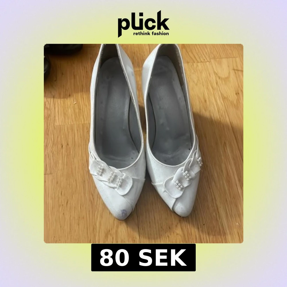 Säljer ett par vita pumps med klack och spetsig tå. Skorna har fina rosetter framtill dekorerade med pärlor och paljetter. Perfekta för dig som vill ha något elegant och klassiskt.