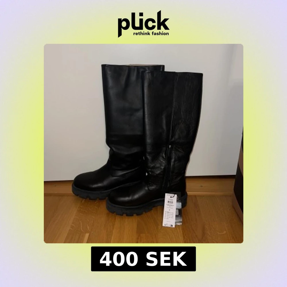 Aldrig använda. Snygga svarta stövlar i äkta skinn från Selected Femme. Modellen är högskaftad med grov sula och dragkedja på insidan. Perfekta för att lyfta din outfit med en cool och stilren look. Nypris: 2400kr.