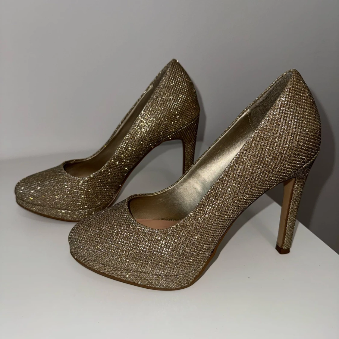 Säljer ett par glittriga pumps i guld från New Look. Skorna har rund tå, hög klack och är täckta av glittrigt material som verkligen sticker ut.